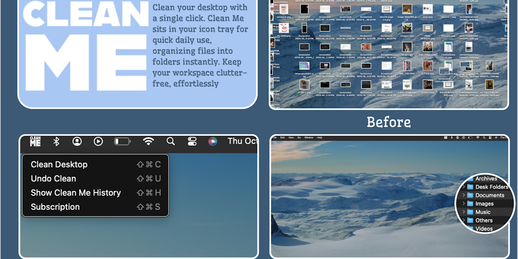 Clean Me is a MacOS app that optimizes workflow with one-click desktop organization. It keeps your workspace clutter-free, boosts productivity, and gives you control over your digital life—all from a