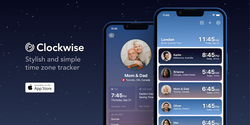 Clockwise is a beautiful app for tracking the local time of friends, family and colleagues around the world. Whether you’re an expat, globetrotter or remote worker, Clockwise will help you stay in syn