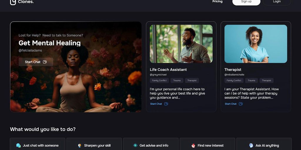 Clones helps you have meaningful conversations and get helpful advice from AI companions tailored just for you. Whether you're looking for expert tips, a friendly chat, or support through life's chall