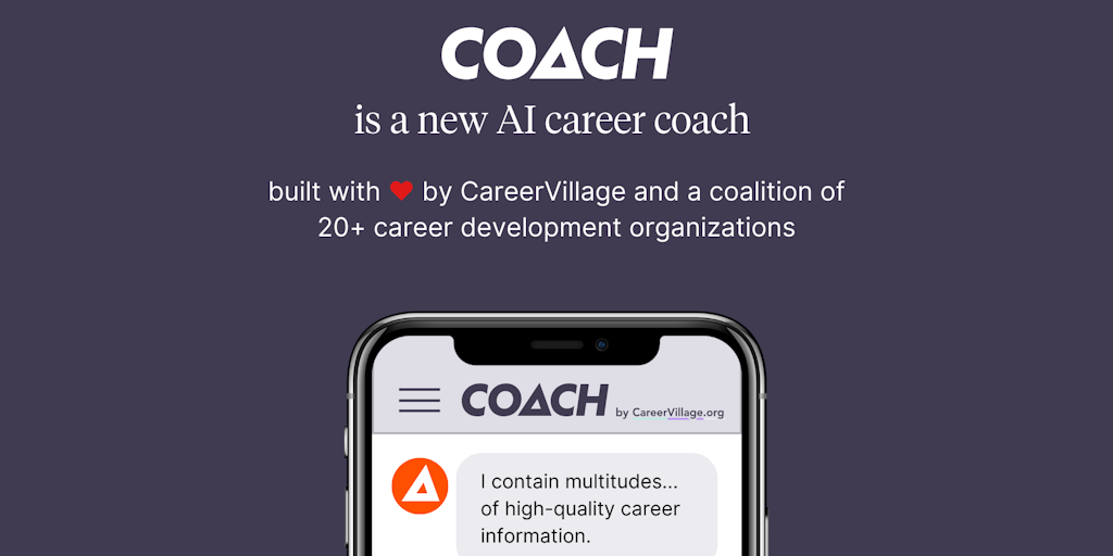 COACH: an AI career coaching platform helping students and jobseekers explore careers, build job materials, interview prep + more. Built by CareerVillage and a coalition of career development orgs wit