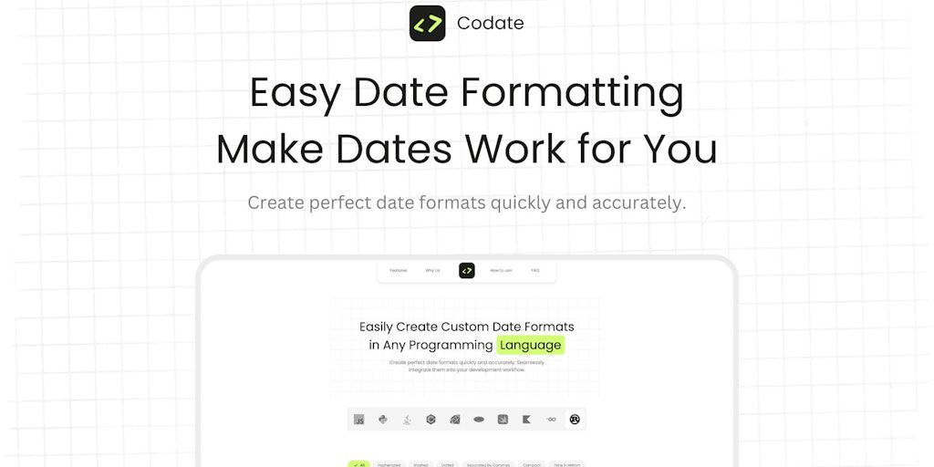 Codate helps you quickly create date formats for any programming language. Just pick your language, choose a date format, and get the code you need. Save time and make coding easier with Codate. Join