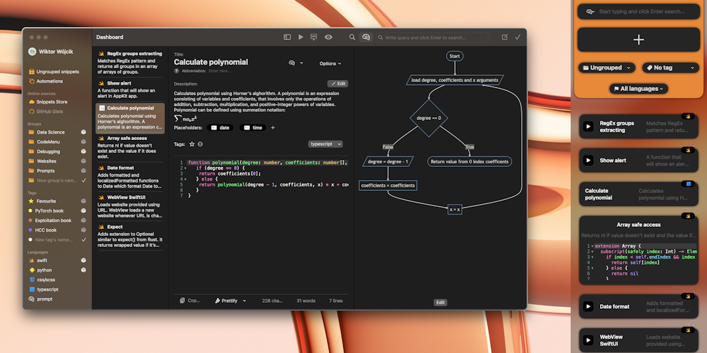 Snippets manager for 60 languages, prompts and RegEx. Organise snippets and enhance them with LaTeX, placeholders, abbreviations and flow diagrams. Use integrated AI to find and document snippets. Run