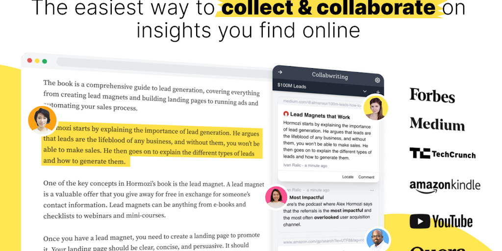 Collabwriting turns a messy browser into seamless team collaboration 💛 Collect snippets of information from anywhere online (even books and videos), attach your own insights, and create a dynamic know