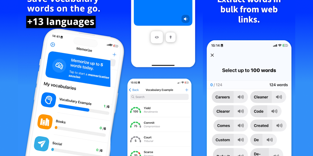 Memorize helps you collect words and save them to memorize later. Save words, web links, and text from other apps and organize them into vocabulary lists. Group, organize, and add new words to your vo