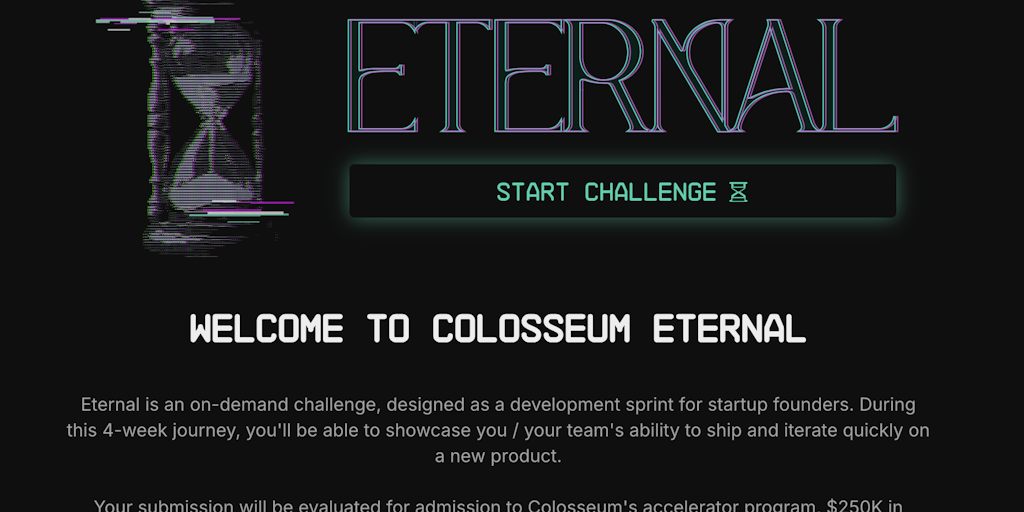 Eternal is a perpetual challenge in-between Solana hackathons that enable founders to initiate an on-demand, 4-week development sprint to compete for $250k in pre-seed funding, acceptance into Colosse