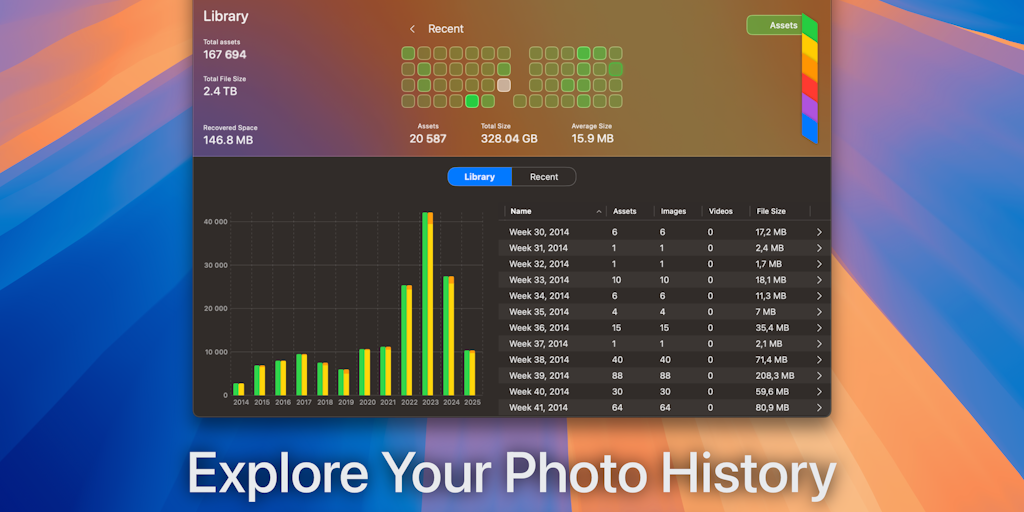Commit Photos transforms your photo collection into a visual contribution graph, helping you understand your storage usage at a glance. Organize your library, reclaim space, and say goodbye to duplica