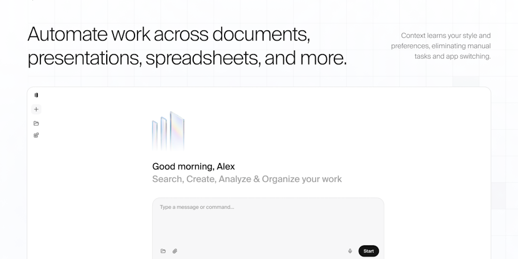 Context is the first AI Office Suite that automates your workflow by creating documents, presentations, spreadsheets, and more using your data, tools, and style.