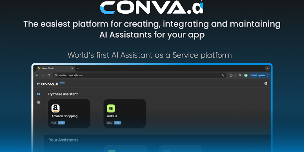 Conva.AI is the world’s first AI Assistant as a Service platform. It empowers companies to effortlessly create, integrate, and monitor AI Assistants within their apps. No need for deep AI expertise—ju