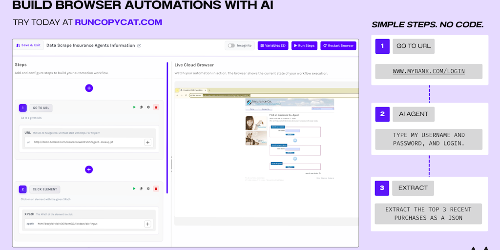 CopyCat is a no-code platform for building browser automations. Using the CopyCat editor, you can automate any web task by combining AI prompts with reliable step-by-step actions.