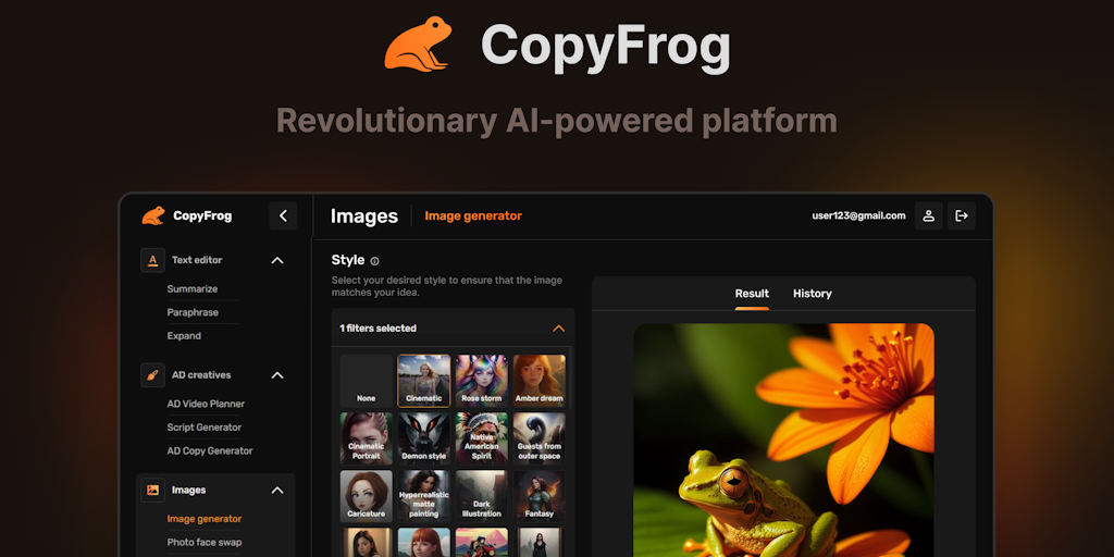 Transform your content strategy with CopyFrog AI! Generate high-quality, engaging content tailored to your audience. Enjoy text creation, image generation, ad crafting, and more under one subscription