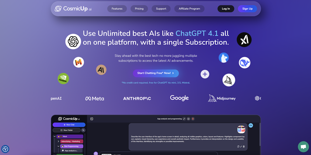 🌌🚀 Welcome to Cosmicup.me, the innovative AI platform! With a single subscription, you can access over 30 cutting-edge models, including ChatGPT, Claude, Gemini, Grok (xAI), LLama, and Midjourney. 🖼️💬