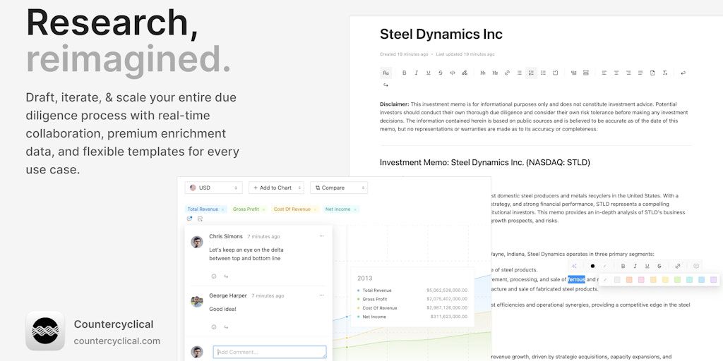 Countercyclical is your all-in-one research platform for performing extensive due diligence, building robust valuations, and running every part of your company's investment process.