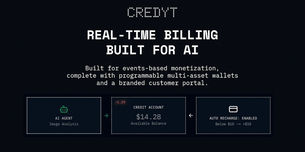 Credyt is a wallet-native monetization engine built for AI. Define pricing in any currency and charge for usage as it happens from pre-funded credit accounts. Give your customers an Open-AI like billi