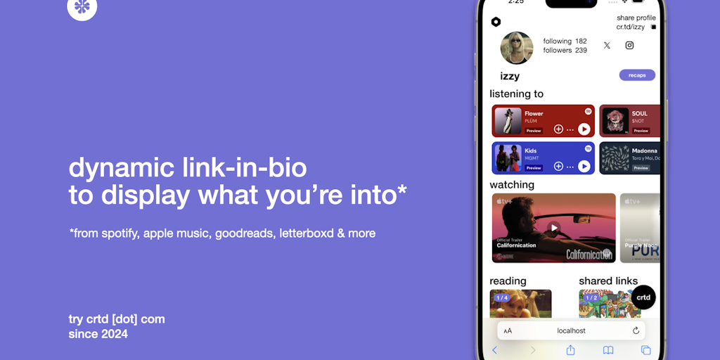 create a dynamic link-in-bio by connecting your spotify, apple music, goodreads, letterboxd accounts, or share links directly via text message to our number. follow your friends and discover what they