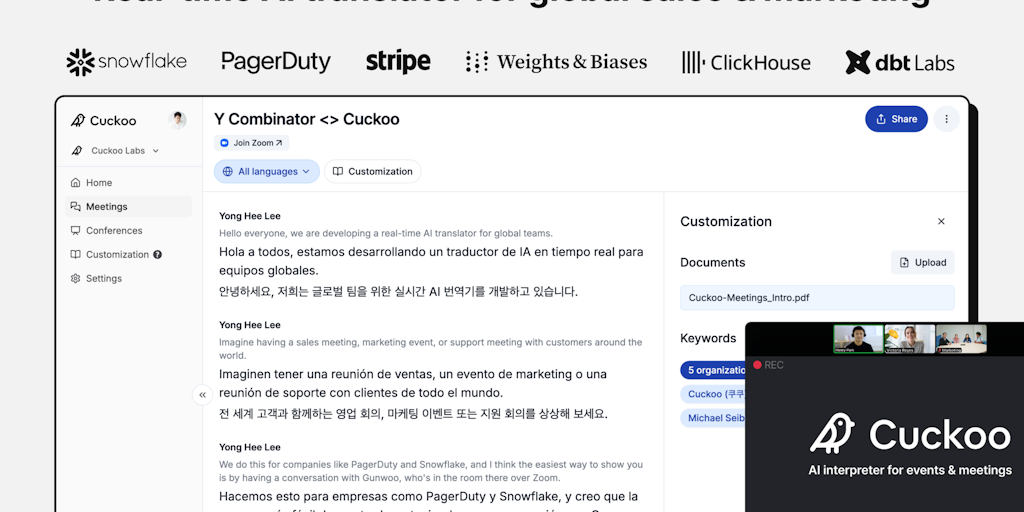 Cuckoo is a real-time AI translator for global sales, marketing, and support. Cuckoo helps companies like Snowflake and PagerDuty talk to their global customers in Zoom in-person meetings, even in the
