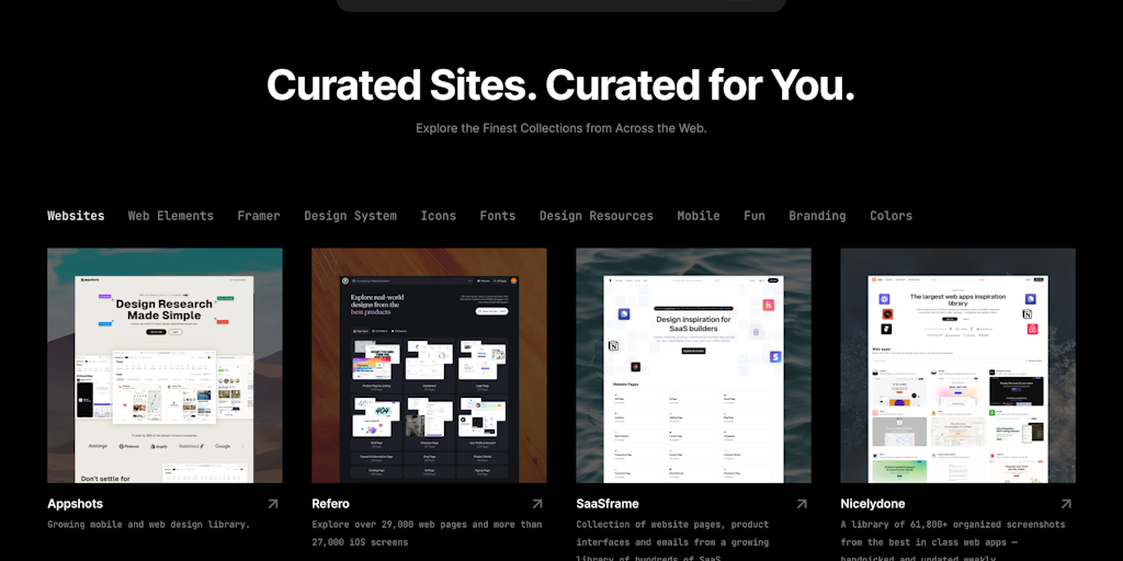 Curation of Curations is a platform uniting top curated websites for designers and developers in a single place. A one-stop hub for inspiration, it saves hours of web scouring.