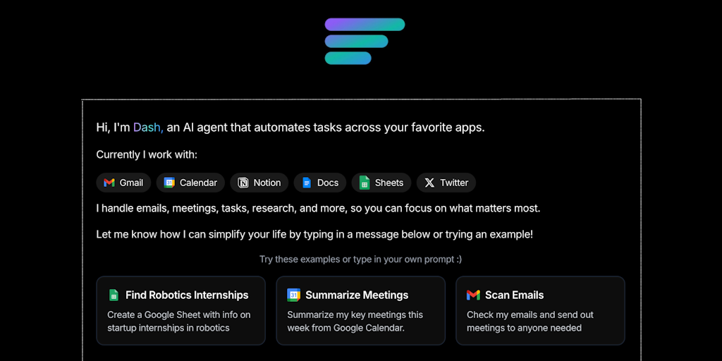 Dash is your AI agent for modern work. It connects to your apps, remembers your context, and gets things done — so you stop wasting time switching, searching, and starting over. Full control, one conv