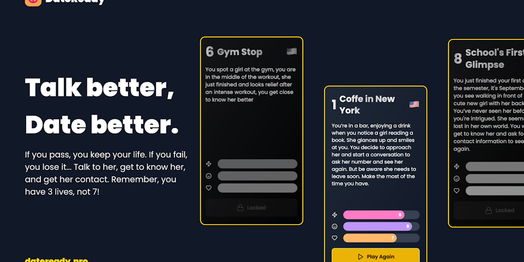 Practice real-life scenarios, get instant feedback, and level up your approach game. Whether prepping for a date or just honing your skills, it’s the fun way to turn anxiety into confidence.