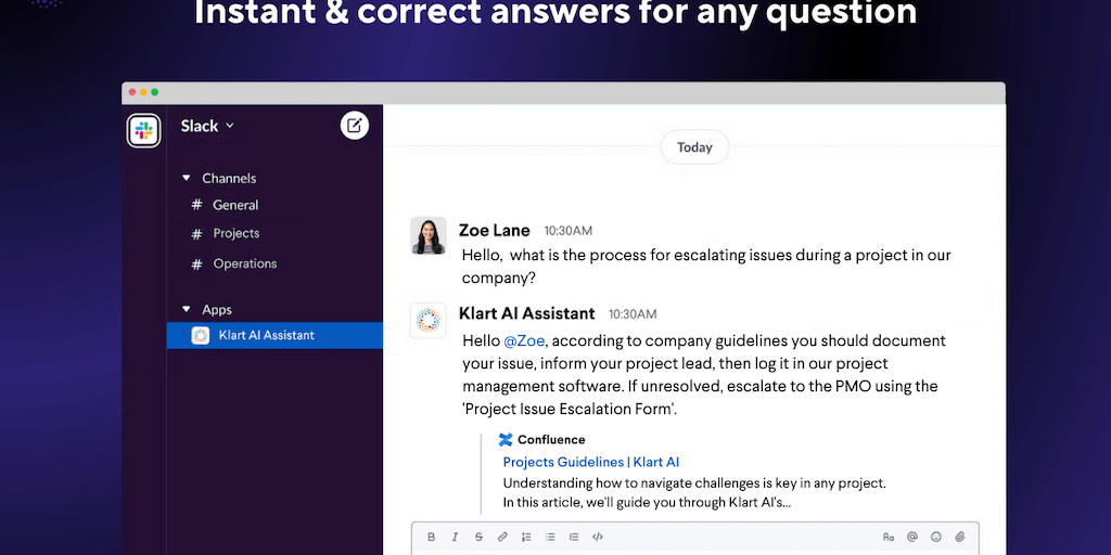 Klart AI, a GPT-4 powered AI Assistant, swiftly resolves employee queries using internal tools via Slack & Teams. Enhancing productivity and revolutionizing the employee experience, all with strict da