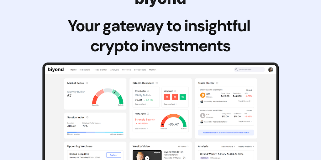 Biyond is a forward-thinking cryptocurrency market intelligence platform. With a fusion of expert analysis, cutting-edge trading indicators, and investable portfolios, we aim to illuminate the crypto
