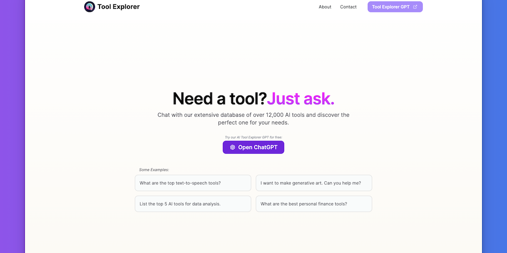 Tool Explorer is a custom GPT that enables you to chat with our extensive database of over 12,000+ AI tools, empowering you to find the perfect product for whatever you need. Tool Explorer is a comple
