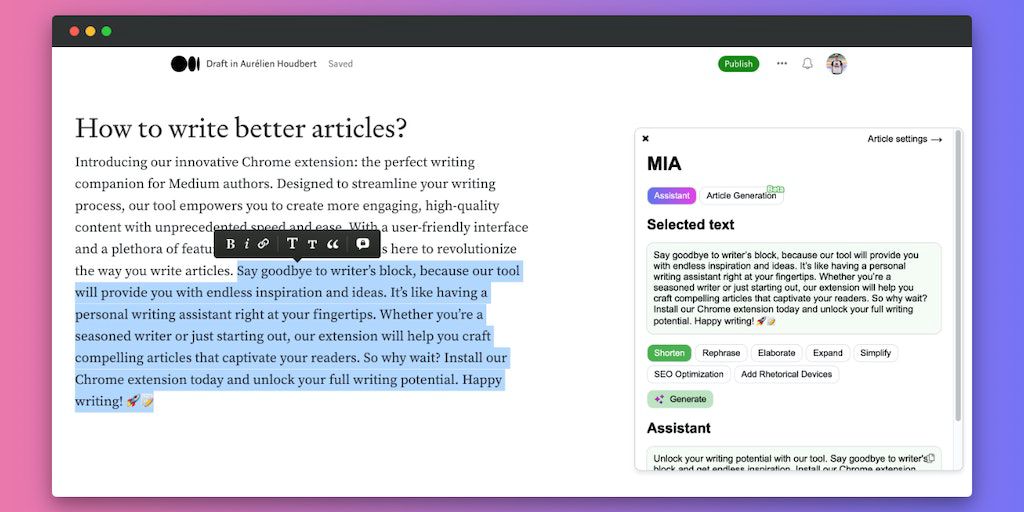 Introducing your #ChatGPT Medium writing assistant, MIA! Draft, highlight, and instantly enhance with AI. MIA adjusts tones, refines styles, and conquers writer's block. Your essential AI sidekick for