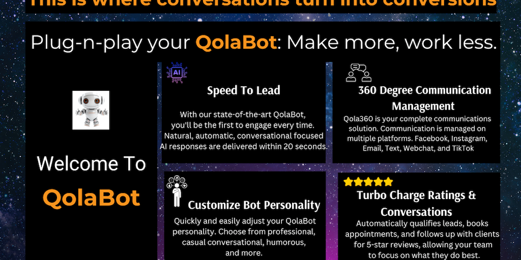 Meet QolaBot, the AI for instant business growth. 50% more conversions and appointments guaranteed. Works on text, web, social, and email. Boost leads and sales effortlessly.
