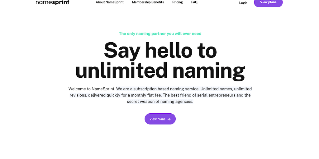 Welcome to NameSprint. We are a subscription based naming service. Unlimited names, unlimited revisions, delivered quickly for a monthly flat fee. The best friend of serial entrepreneurs and the secre