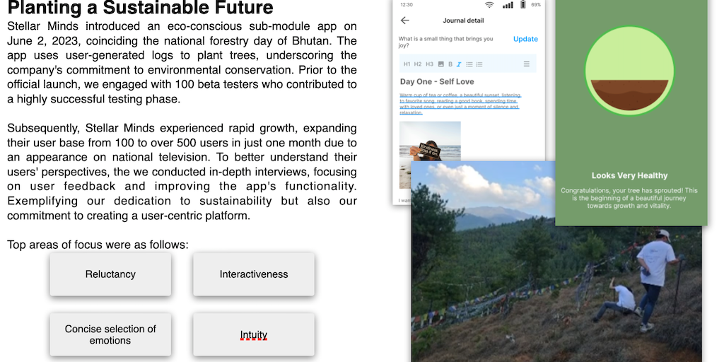 Stellar Minds is an journaling app that gamifies self-care by planting virtual trees that can be grown into real trees. The app tracks users' streaks and offers rewards for consistent journaling. Make