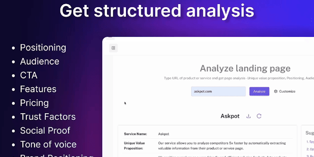 A competitive analysis tool that enables you to swiftly analyze product or service and extract Unique Value Propositions, Positioning, Target audiences, Pricing, Tone of Voice, while also generating S