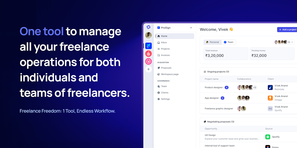 One tool to manage all your freelance operations for both individuals and teams of freelancers. Individuals can create teams of freelancers, receive project opportunities, and automate all their opera