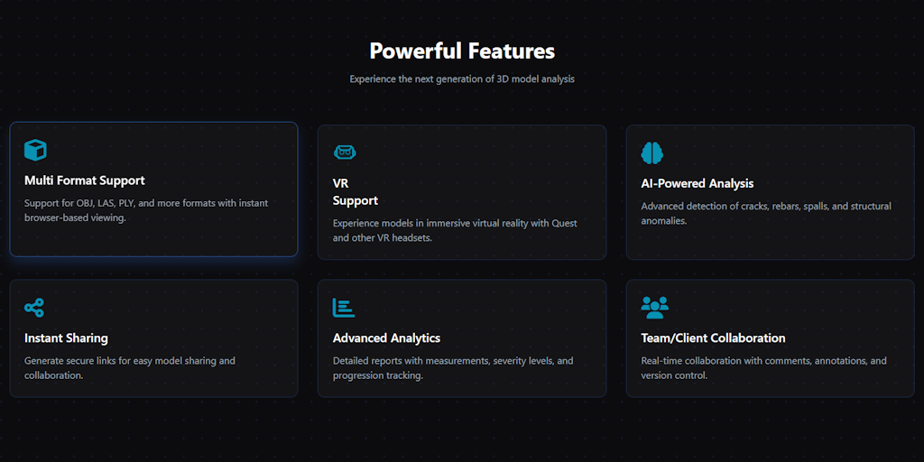 Upload, analyze and share 3D models with AI-powered defect detection. Support for VR/AR visualization and collaborative inspection features.