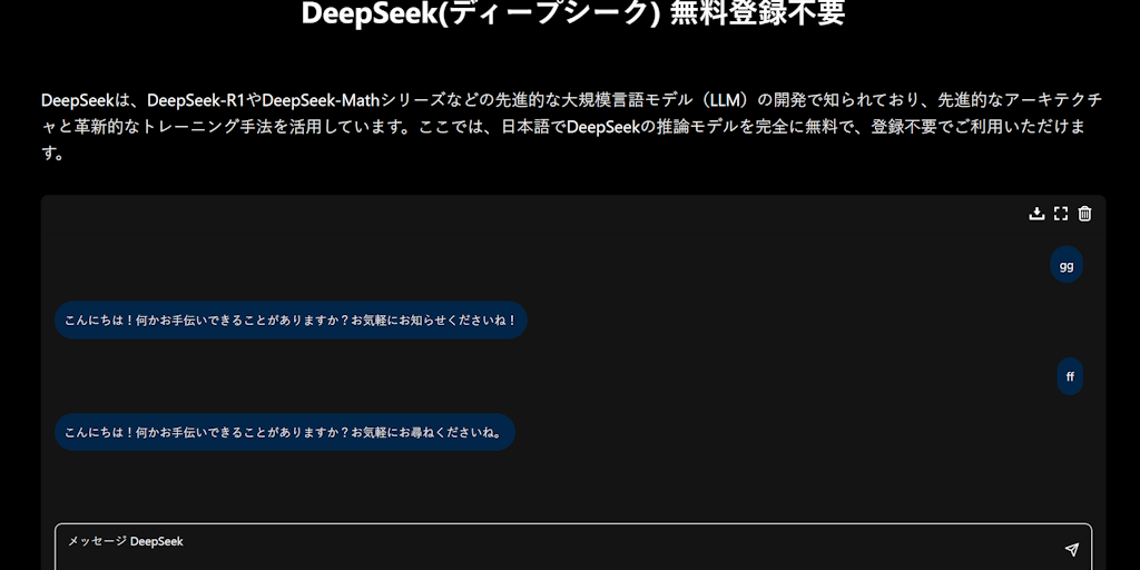 日本語でDeepSeekを完全に無料で、登録不要でご利用いただけます。数学からコーディングまで、複雑な問題を解決します。