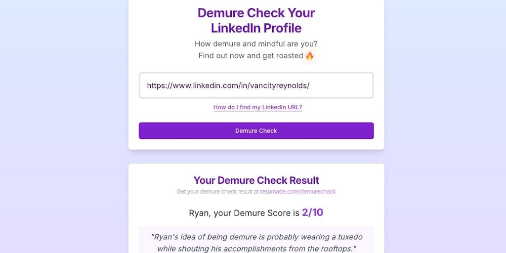 How demure and mindful are you? Find out now and get roasted 🔥 This free funny tool lets you input your LinkedIn profile and you get a Demure score + roast back. Brought to you by www.resumade.com