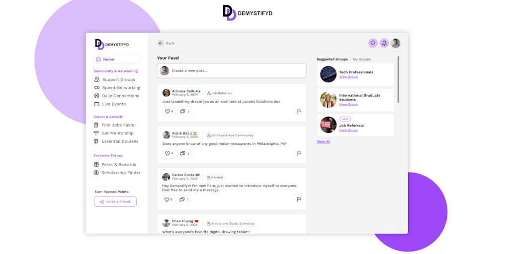 Demystifyd is the ultimate networking and career platform for U.S. international students & immigrants. Get AI-powered visa-sponsored job matches, 1:1 video speed networking, mentorship, curated cours