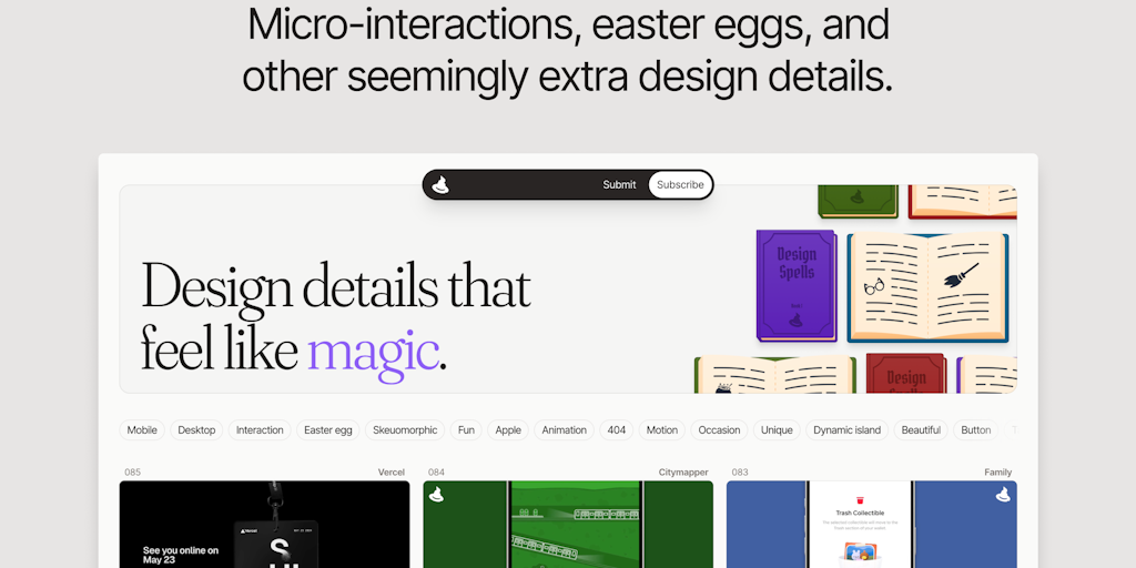 A new home on the internet for micro-interactions, easter eggs, and other seemingly extra design details that infuse life, personality, and fun back into the web.