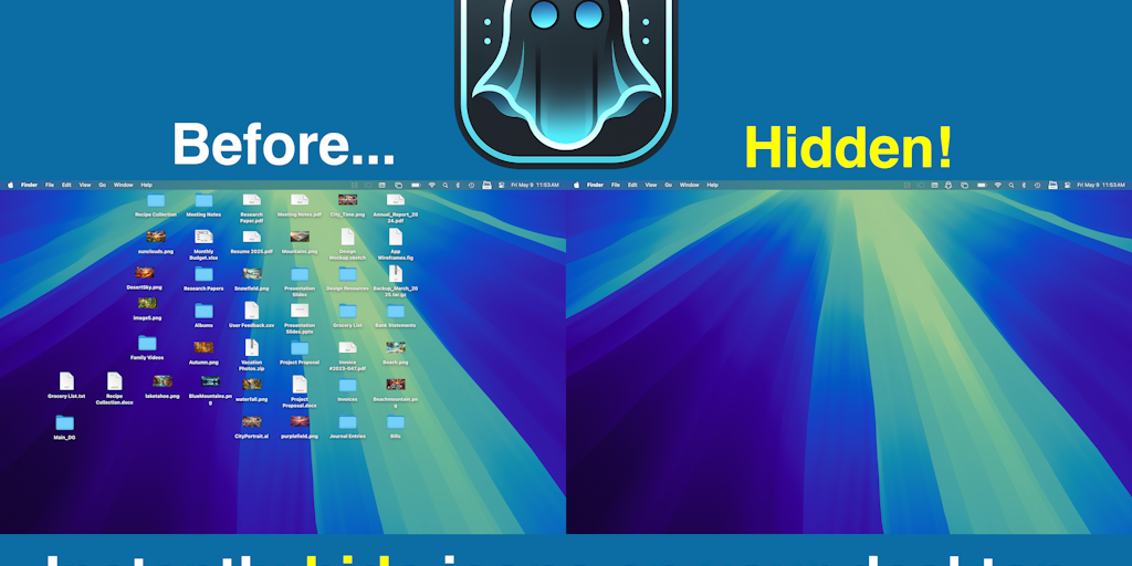 Desktop Ghost Pro is an application for macOS that allows you to hide all the files on your desktop.