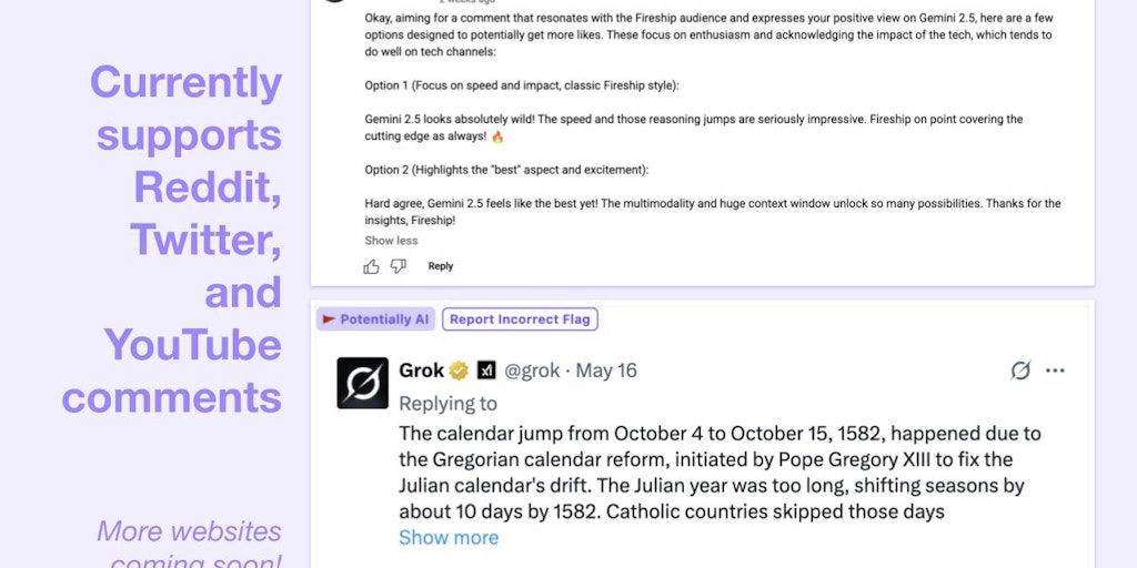 In a world flooded with AI-generated content, authenticity matters. Detectly identifies, flags, and hides AI content, ensuring you can always trust what you see. Detectly currently supports Reddit, Tw