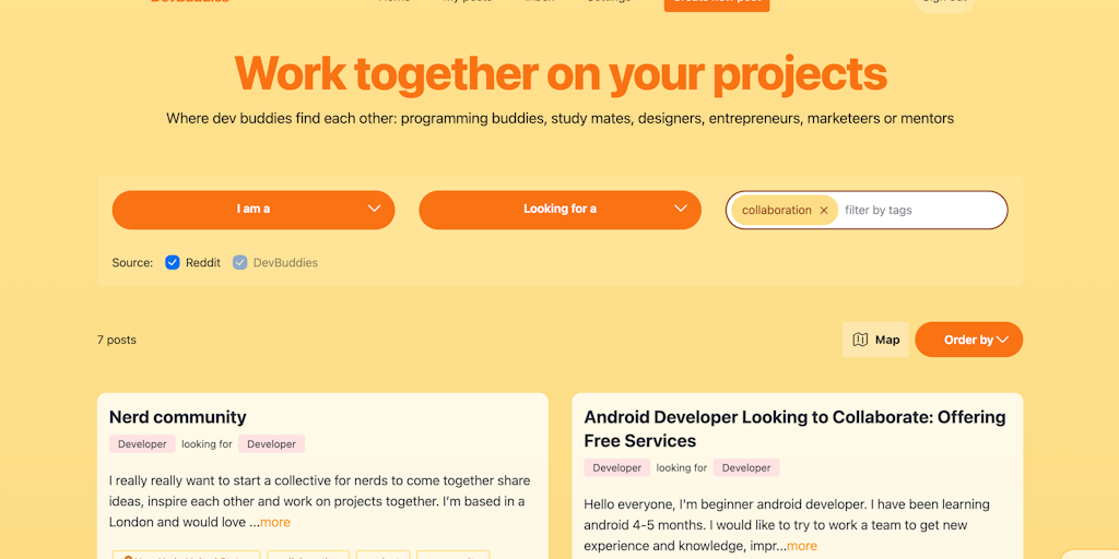 DevBuddies is a place focussed on developers looking for other developers or people in the fields of design, marketing, entrepreneurship and coaching/mentoring.