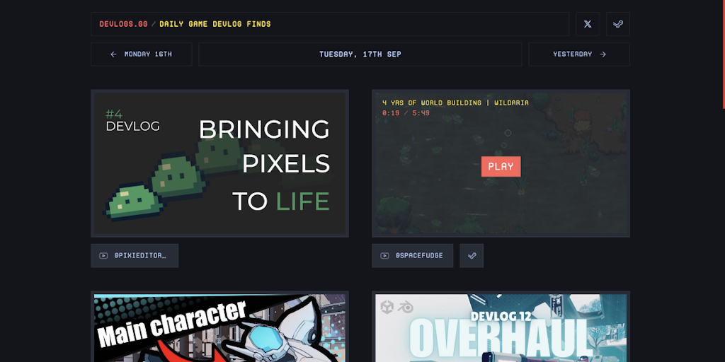 devlogs.gg is the start of a much bigger idea. For now, we hand pick awesome indie game devs on Youtube, and share their work here. Next, I want make a job board, asset store, private profile links an