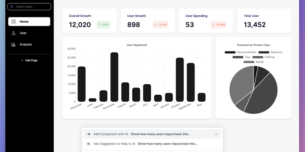 Create your own dashboard or admin panel without code and with the help of AI. Easily update and analyze your data in real-time with AI. Perfect for startups and businesses who want quick insights. `f