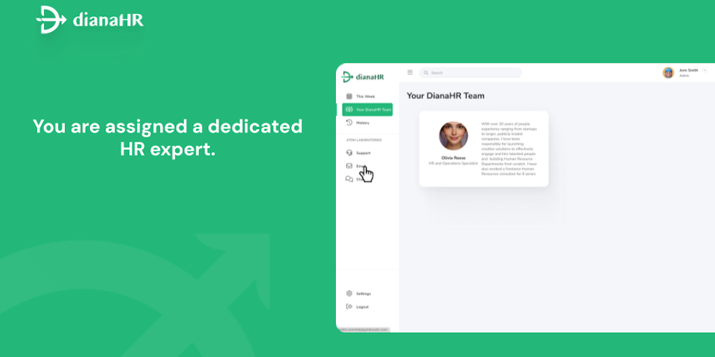 DianaHR is an HR and Ops Manager for your company. DianaHR's AI powered HR experts will remove the pain of employee onboarding, state registration, employee HR questions, and much more.