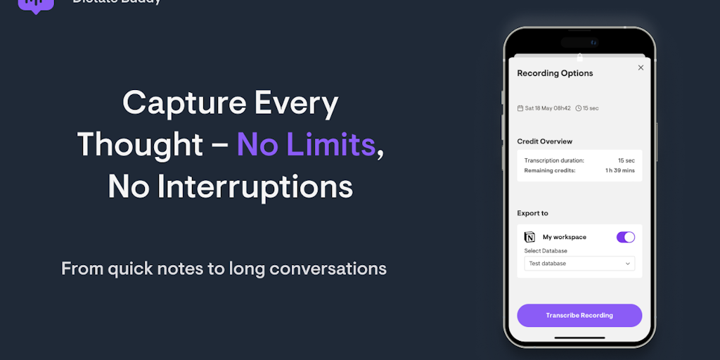 Dictate Buddy is a powerful speech-to-text app that uses Whisper AI for accurate transcription. But also let you connect your Notion account to seamlessly export your transcriptions and organize your