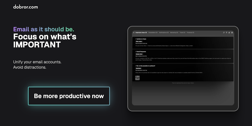 Dobror is a minimalist email client that helps you focus on what really matters. Own your attention and use dobror to avoid being attacked by marketing - connect all your email accounts together in a