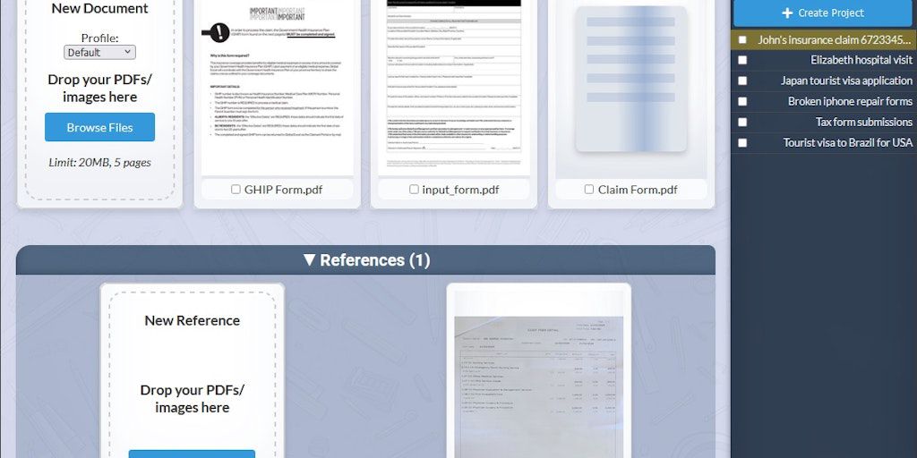 Docamine is an online tool to ease the pain of filling out PDFs/image documents without labeled fields using AI. Upload reference docs, reuse forms, organize documents into projects, draw signatures,
