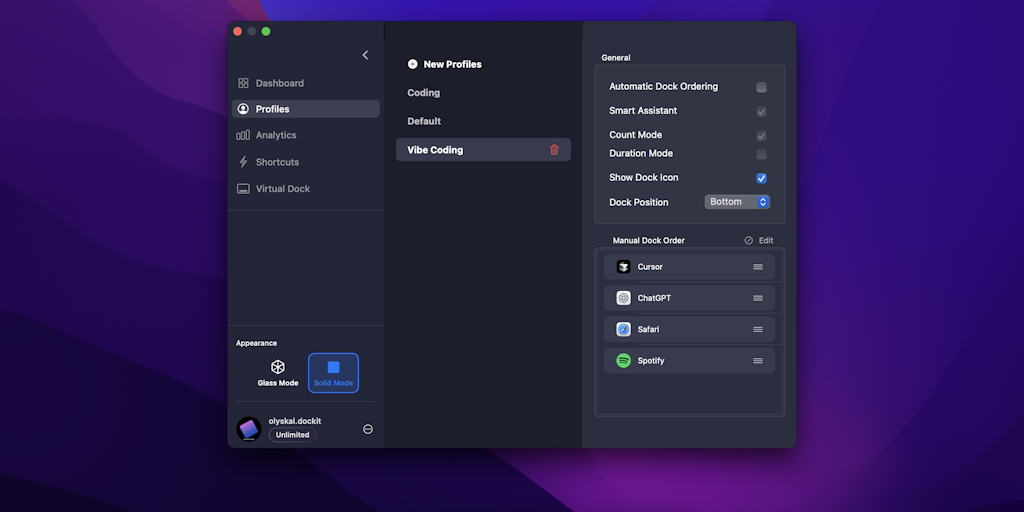 Create custom dock profiles for different workflows and boost your productivity. DockIt helps you organize your Mac experience with seamless profile switching and smart automatic Dock sorting based on