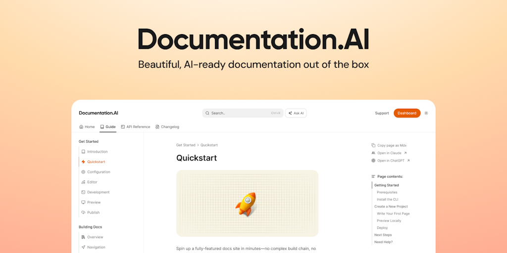 Create beautiful, always-current product documentation with AI. A built-in AI agent helps you write and maintain content and connects to dev and support tools for context. Edit via web, AI agent, or d