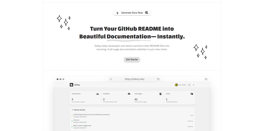 Doksy helps you transform GitHub README files into clean, professional documentation websites in just a few clicks. Simple, fast, and customizable.