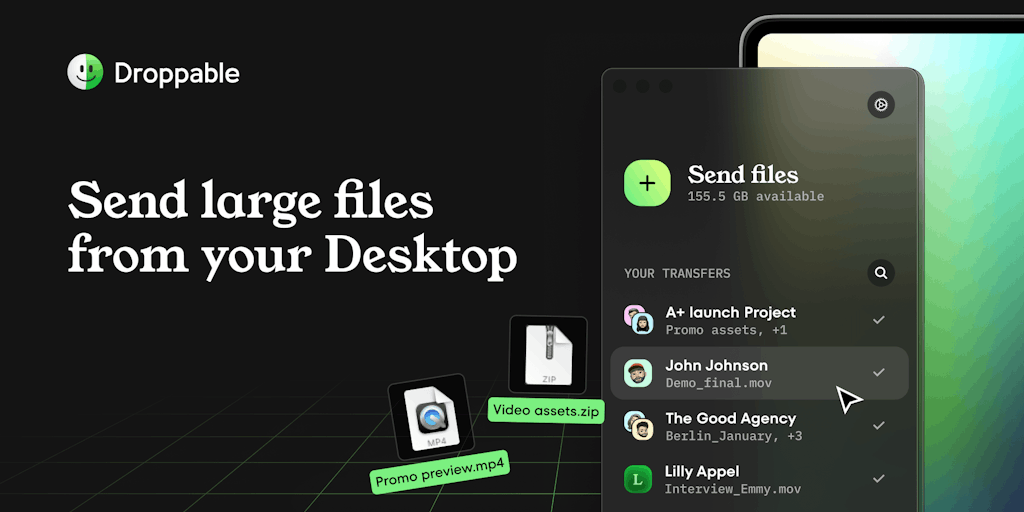 Droppable is a native macOS app for sharing large files (up to 2TB), specifically designed for creatives. It has a clean messenger-style UI and imported contacts that lets users share files quicker an