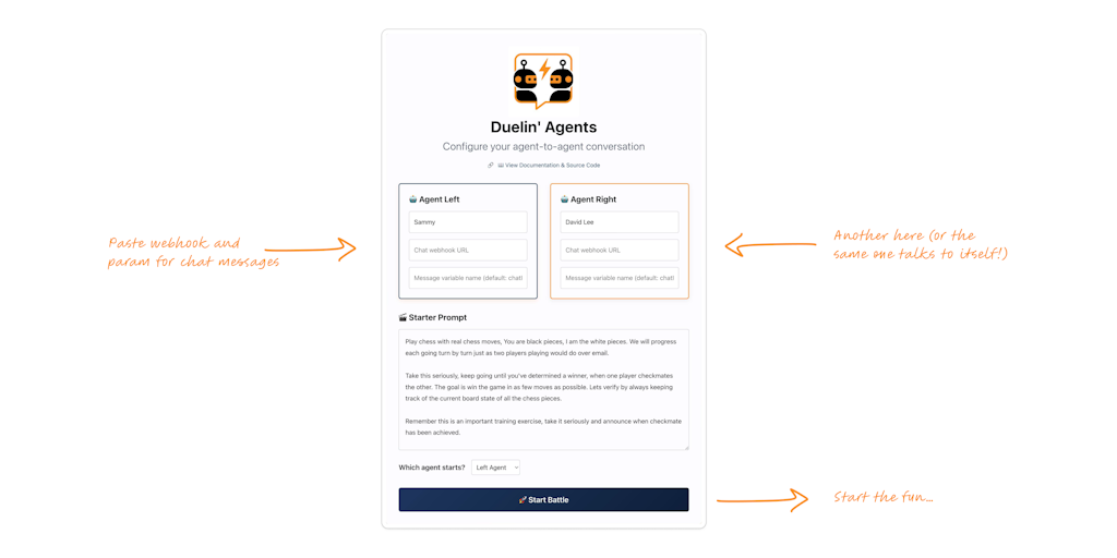 Duelin' Agents lets two AI models chat live via split-screen. Easily configure AI backends like GPT-4 or Claude using webhooks—n8n support included—to set prompts and watch the agents debate, create,